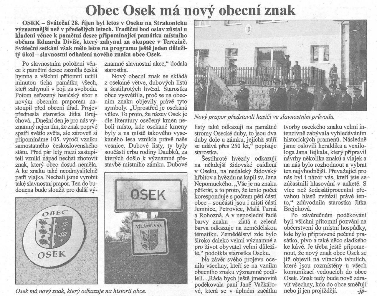 Slavnostní odhalení obecního znaku obce Osek.